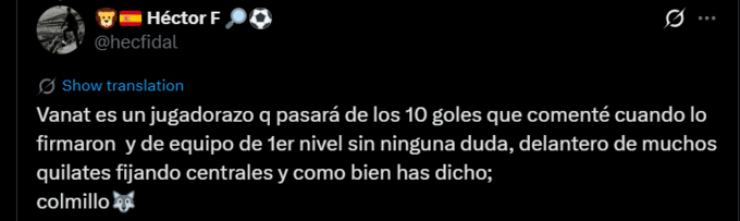 Héctor: Ванат – фантастичний гравець, який перевершить 10 голів, про які я згадував, коли він підписував контракт, і він, безсумнівно, гравець найвищого рівня. Нападник виняткової якості, він тисне на захисників.