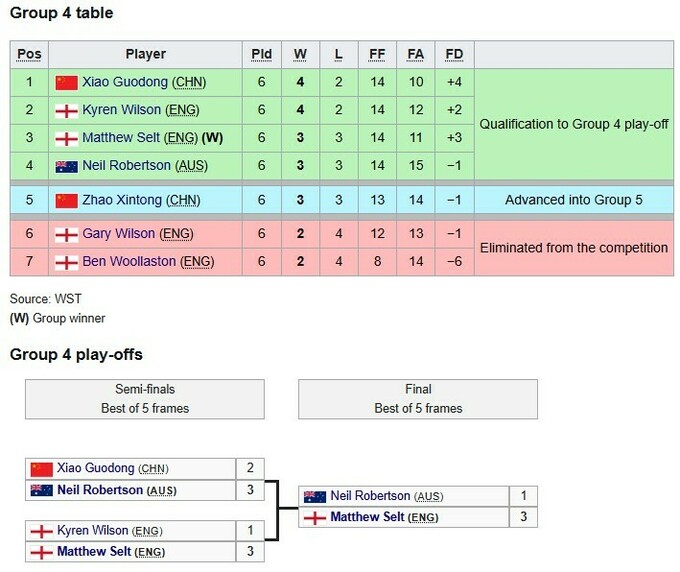 Переможцем групи 4 став Метью Селт, який взяв гору над австралійцем Нілом Робертсоном (3:1).