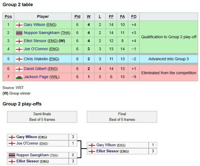 У групі 2 найкращим став Елліот Слессор, який у напруженій фінальній зустрічі переміг Гері Вілсона (3:1) і також вийшов у фінальний етап турніру.