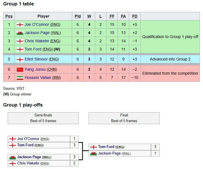 Переможцем групи 1 став досвідчений снукерист Том Форд, який відкрив свої виступи в цьому сезоні переконливою перемогою та забезпечив собі місце на наступному етапі, вигравши вирішальний матч групи у Джексона Пейджа (3:1).