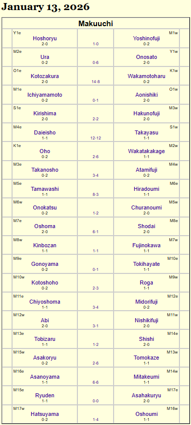 Завтра, 13 січня, Аонішікі Арата боротиметься зі ще одним маеґашірою №1 Дайкі Ічіямамото, який стартував з поразок від йокодзун Оносато і Хошьорю. У попередніх двох очних поєдинках Явгусишин майбутнього суперника переміг.