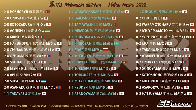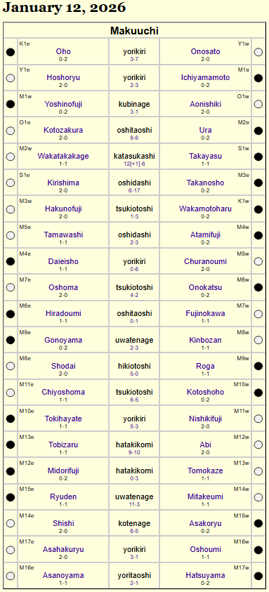 Hatsu Basho триватиме до 25 січня. Протягом 15-ти днів усі борці проведуть по 15 сутичок.
