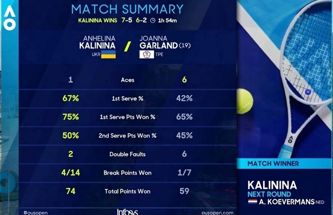 Ангеліна перервала вінстрік Гарленд з п'яти матчів. Минулого тижня Джоанна стала чемпіонкою змагань WTA 125 в Канберрі.