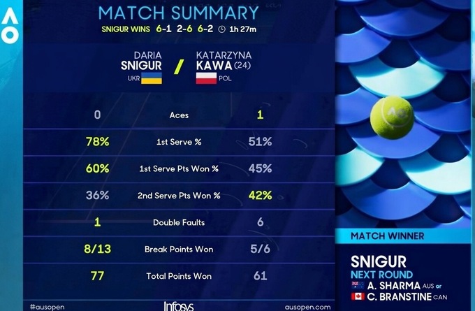 Українська тенісистка Дар'я Снігур (WTA 136) успішно стартувала у кваліфікації Відкритого чемпіонату Австралії 2026.