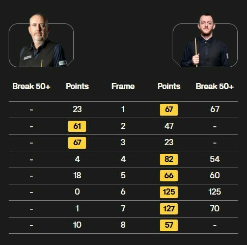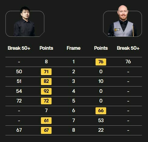 Це поклало край надіям Вілсона на камбек, адже Чжао завершив матч у наступному фреймі серією 67. Всі чотири поєдинки цього тижня завершилися з рахунком 6:2.