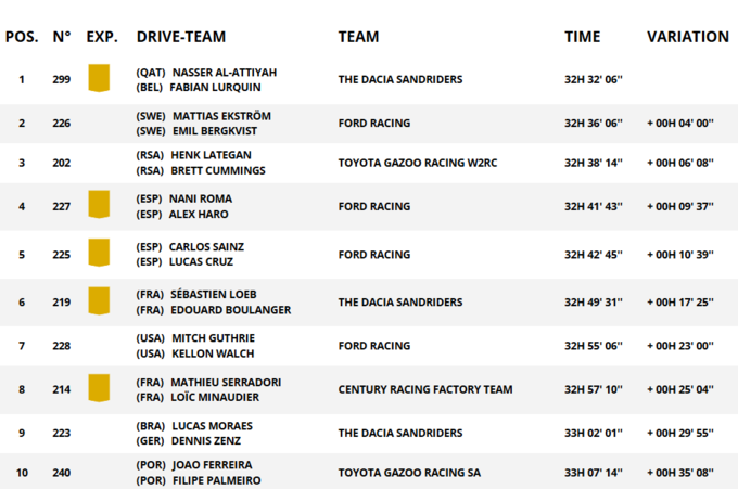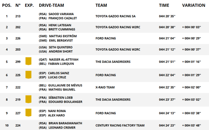 Третім фінішував Маттіас Екстрьом, поступившись лідеру 29 секунд, попри те що відкривав трасу. Сет Квінтеро забезпечив Toyota Hilux місце в топ-4, випередивши Аль-Аттію, який став п’ятим.