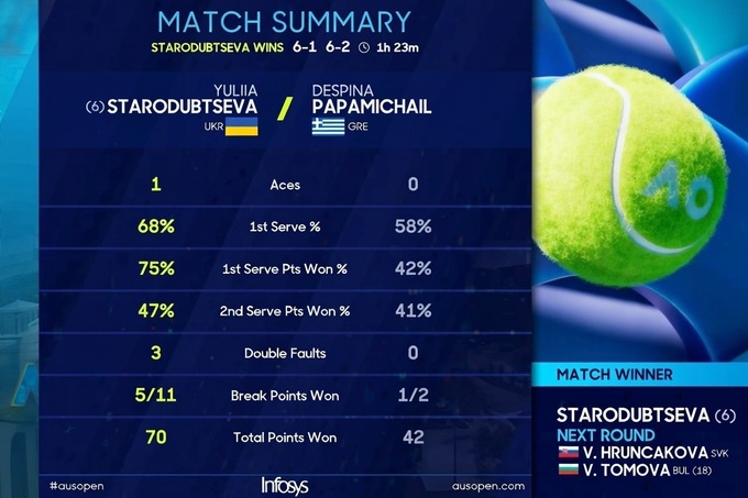 Юлія Стародубцева (Україна) [6] – Деспіна Папаміхаїл (Греція) – 6:1, 6:2