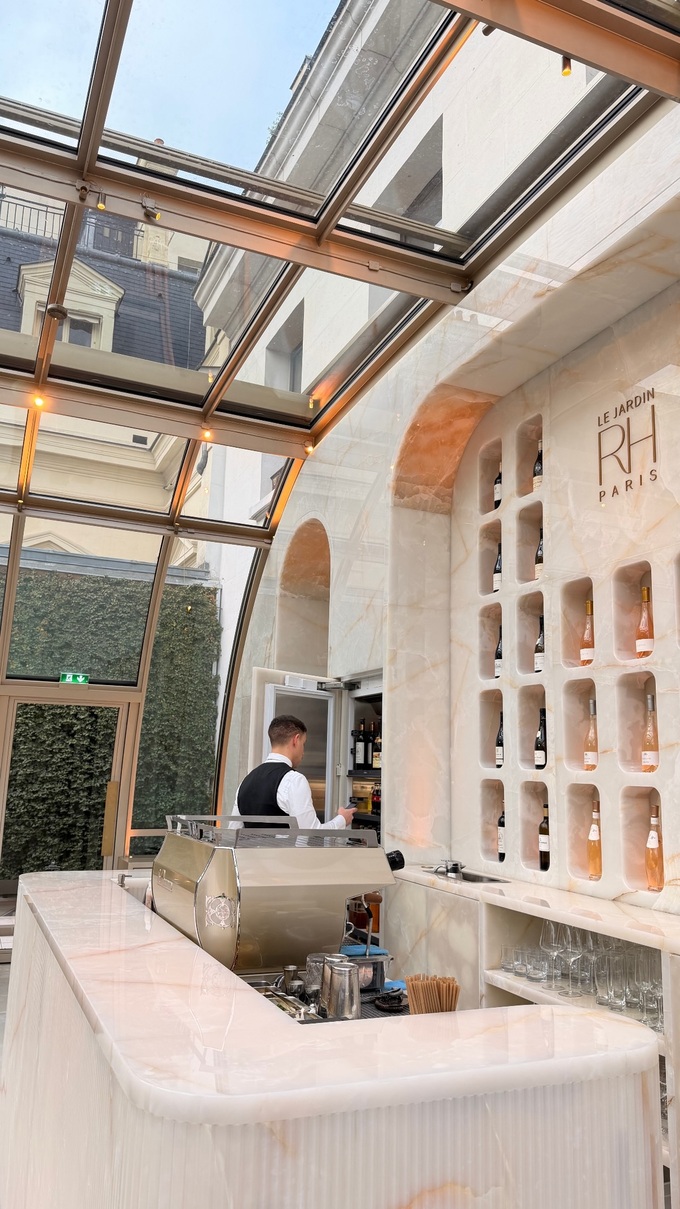 Заклад є частиною простору RH Paris і відомий своєю ефектною скляною покрівлею в стилі Гран-Пале та світлим мінімалістичним інтер’єром.