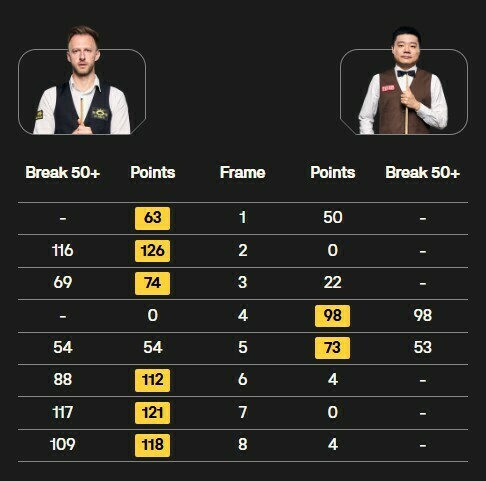 Однак китаєць Дін не забив жодної кулі в останніх трьох фреймах, тоді як Трамп завершив матч у чудовому стилі, оформивши брейки у 88, 117 та 109 очок (6:2). Він зустрінеться з Алленом у четвер, 15 січня, увечері.
