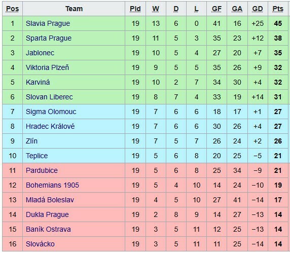 Лідери чемпіонату Чехії: Славія Прага (45 очок), Спарта Прага (38), Яблонець (35), Вікторія Пльзень, Карвіна (32), Слован Ліберець (31).