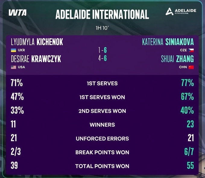 Результати Кіченок і Кравчик на турнірі WTA 500 в Аделаїді: