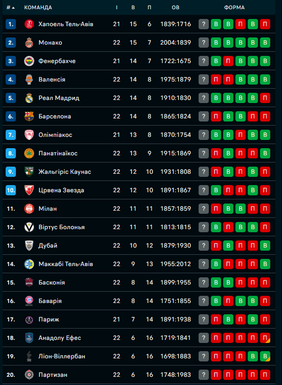 Завершився 22-й тур регулярного чемпіонату Євроліги
