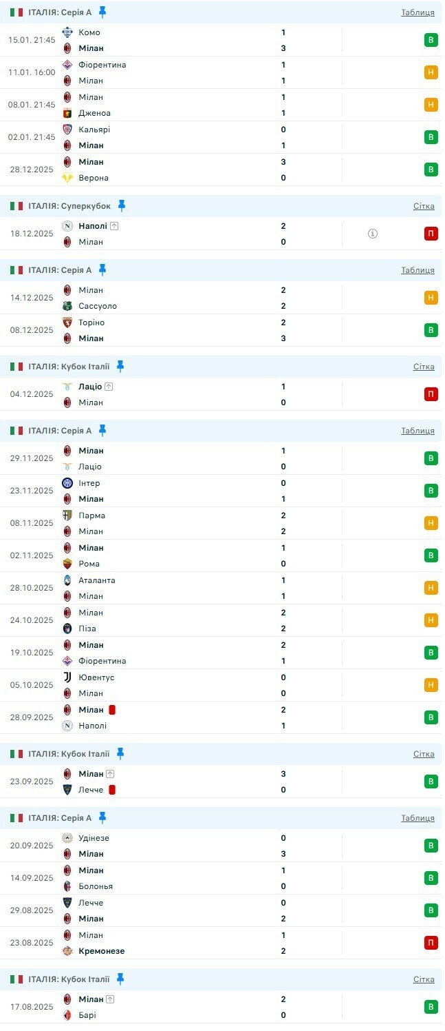 | 2 | Мілан | 20 | 12 | 7 | 1 | 33 - 16 | 18.01.26 21:45 Мілан - Лечче15.01.26 Комо 1:3 Мілан11.01.26 Фіорентина 1:1 Мілан08.01.26 Мілан 1:1 Дженоа02.01.26 Кальярі 0:1 Мілан28.12.25 Мілан 3:0 Еллас Верона | 43 | |