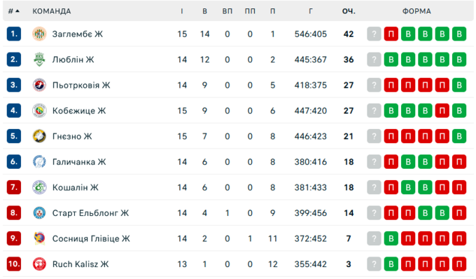 Кошалін також має в активі 18 очок. Команда йде на сьомому місці, поступаючись Галичанці за додатковими показниками.