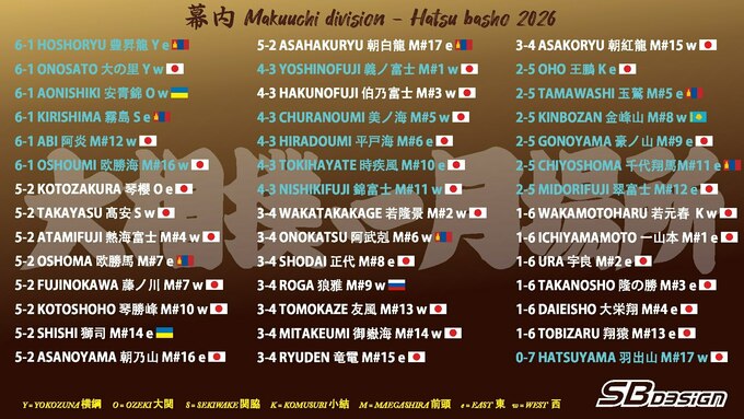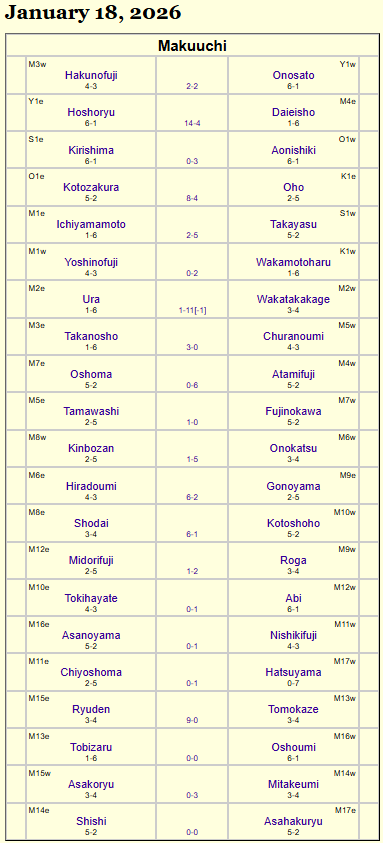 Hatsu Basho триватиме до 25 січня. Протягом 15-ти днів усі борці проведуть по 15 сутичок.