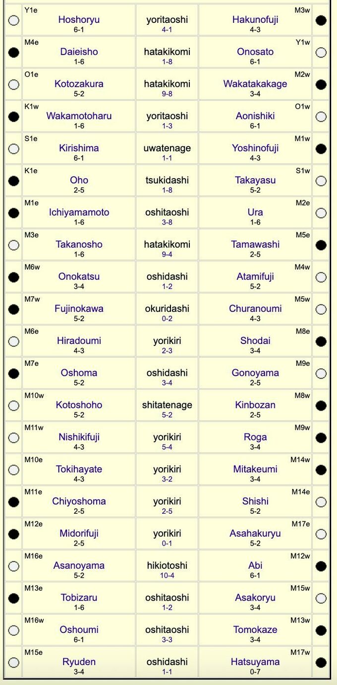Так само як Аонішікі, шості перемоги здобули і відповідно теж стали співлідерами Hatsu Basho обидва йокодзуни. Причому обоє виграли не без проблем. Японець Дайкі Оносато вже вкотре опиняється на грані поразки, але якимось неймовірним чином і завдяки помилкам суперників перемагає. Цього разу в кроці від перемоги над йокодзуною був маеґашіра №4 Гаято Даєйшо (1 – 6). Але цього кроку він не зробив.