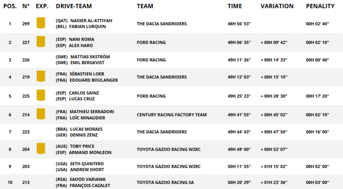 Нассер Аль-Аттія на Dacia завершив фінальний етап лише 33-м із відставанням 8 хвилин від переможця. Проте цього виявилося достатньо, щоб забезпечити йому загальну перемогу шостий раз у кар’єрі з перевагою у 9 хвилин. Тепер катарець відстаєна перемоги від рекорду Стефана Петерханзеля, який має 8 перших місць у класі авто.