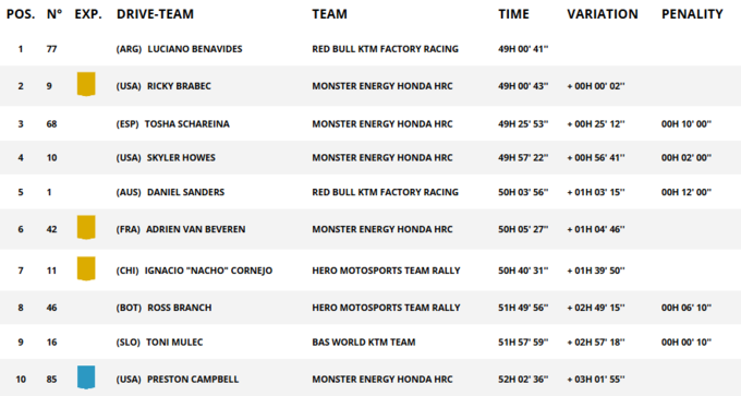 У класі мотоциклів перемогу здобув Лукаано Бенавідес (KTM), випередивши Рікі Брабека (Honda) всього на 2 секунди після 13 етапів. Для Бенавідеса це перший триумф у дев’яти спробах, а KTM святкує 21-у перемогу на Дакарі. Третє місце посів Тоша Шарейна (Honda), випередивши свого напрника Скайлера Хауза. Попередній лідер Даніель Сандерс (KTM) травмував ключицю і завершив п’ятим