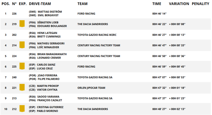 Матиас Екстрьом фінішував третім у підсумковій класифікації, а Себастьян Льоб на Dacia став другим на етапі і четвертим у загальному заліку, відставши від подіуму всього на 37 секунд.