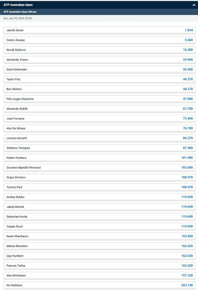 Перед стартом австралійського мейджора букмекерські контори виставили актуальні котирування на майбутнього переможця в чоловічому одиночному розряді.