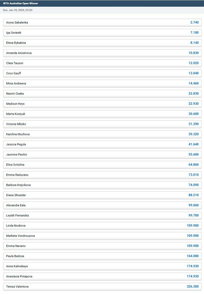 Головною фавориткою австралійського мейджора букмекери вважають першу ракетку світу і чинну чемпіонку Аріну Соболенко – 2,73. У топ-5 також входять Іга Свьонтек (7,18), Єлена Рибакіна (8,14), Аманда Анісімова (10,83) і Клара Таусон (12,02).