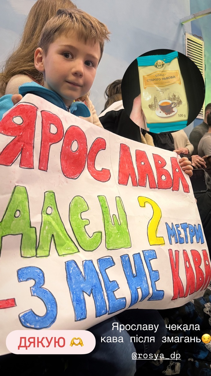 Після перемоги Ярослава поділилася сторіс із манежу, де юний уболівальник тримав яскравий плакат з обіцянкою пригостити чемпіонку кавою у разі успішного стрибка на 2,03 м. Обіцянку було виконано – після змагань Магучіх справді забрала заслужену каву.