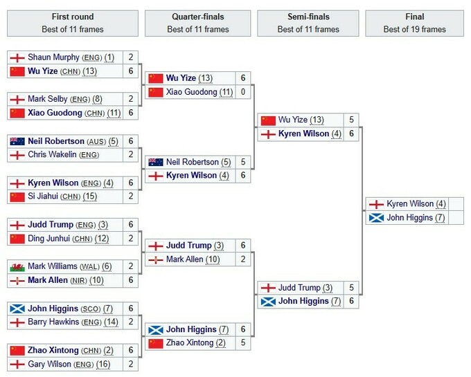 У фіналі зіграють англійський снукерист Кайрен Вілсон та шотландець Джон Хіггінс