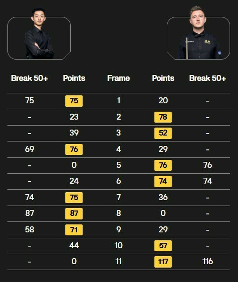 А у неділю на нього чекає інтригуючий поєдинок проти легенди Джона Хіггінса. Вілсон виграв лише три з їхніх 11 попередніх зустрічей, але можна згадати перемогу 13:8 над шотландцем на шляху до тріумфу на ЧМ-2024 у Крусиблі два роки тому.