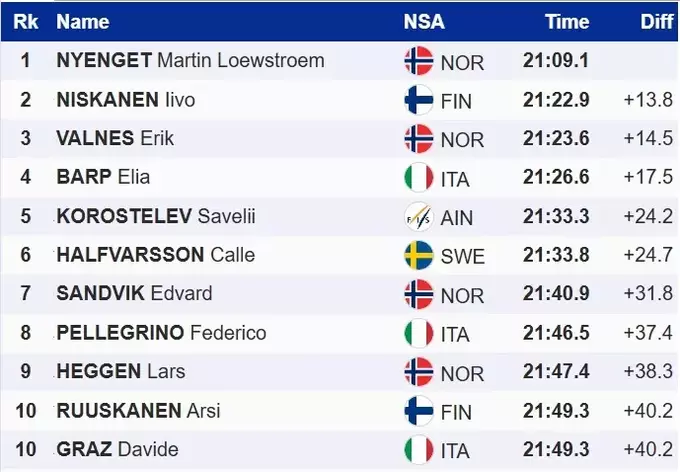 Норвежець Мартін Льовстрьом Ньєнгет оформив другу перемогу в сезоні на Кубку світу, подолавши 10 кілометрів за 21 хвилину та 9 секунд.