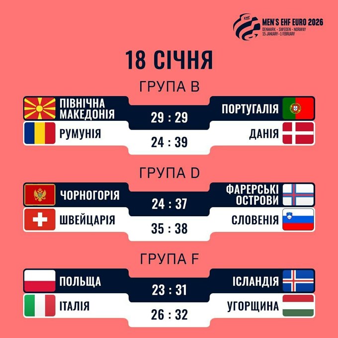 У неділю, 18 січня, на чемпіонаті Європи з гандболу серед чоловічих команд пройшли шість матчів. Свої другі поєдинки на турнірі провели збірні груп B, D та F.