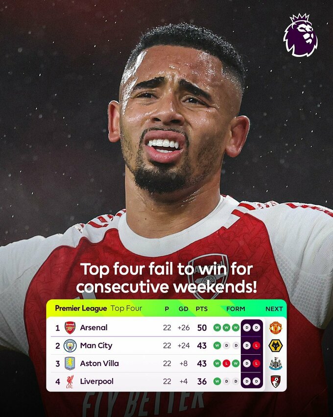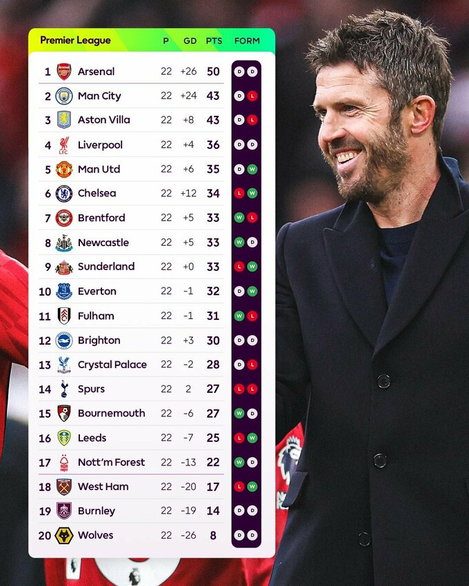 Топ-6 АПЛ: Арсенал (50 очок), Манчестер Сіті, Астон Вілла (43), Ліверпуль (36), Ман Юнайтед (35), Челсі (34).