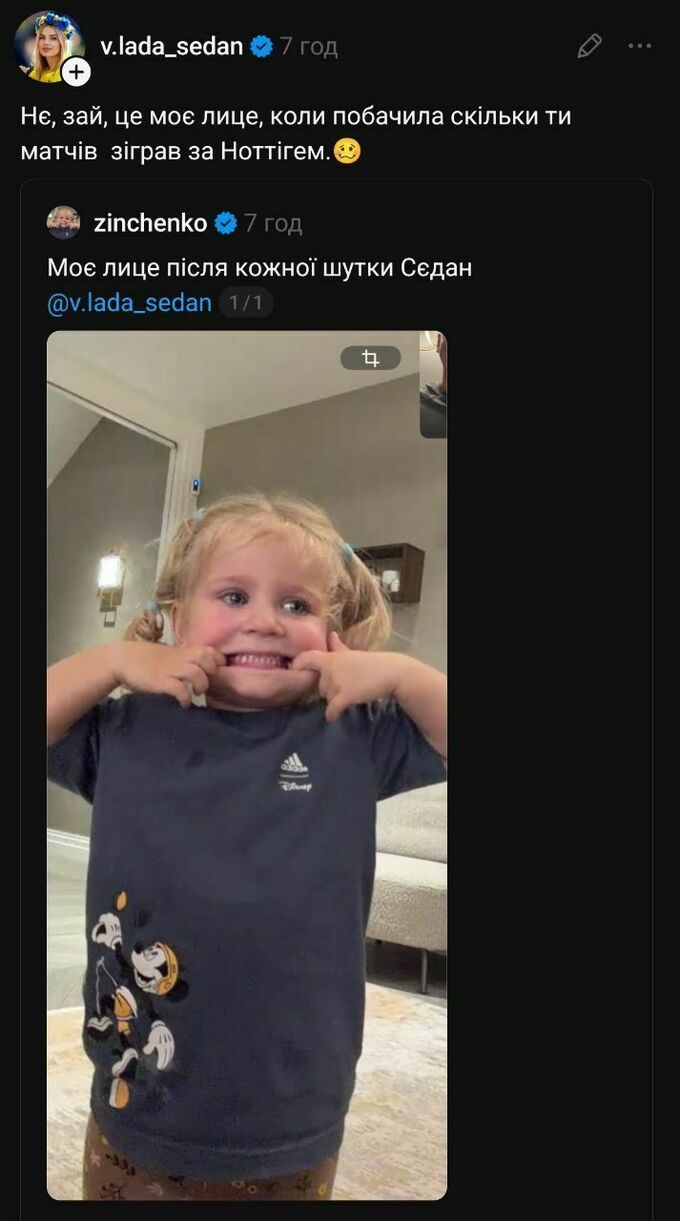 Дружина українського футболіста Олександра Зінченка Влада Седан пожартувала з приводу його виступів за «Ноттінгем Форест».