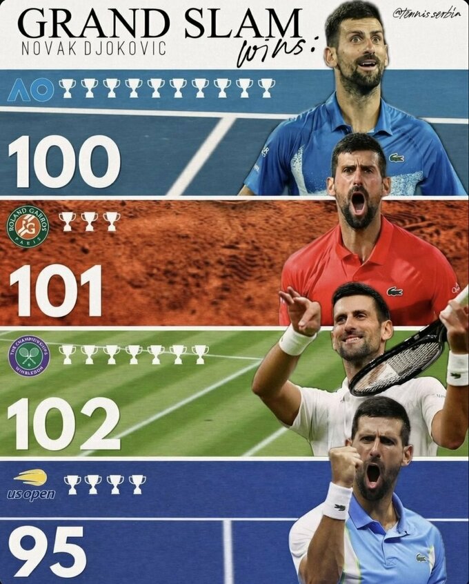 Також Джокович – перший тенісист, який досяг цієї позначки на трьох різних турнірах Grand Slam (101 – Ролан Гаррос, 102 – Вімблдон). На US Open у Новака 95 перемог.