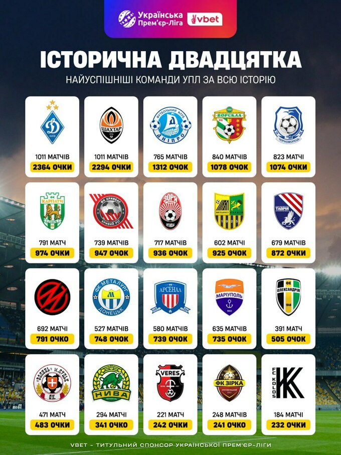 Прем'єр-ліга опублікувала рейтинг найуспішніших команд в історії чемпіонатів України за кількістю набраних балів в елітному дивізіоні.