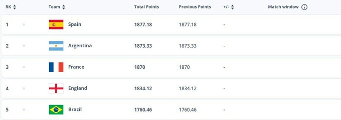 У першій трійці всі найсильніші збірні планети залишилися на своїх місцях: Іспанія лідирує, другою йде Аргентина, на третьому місці розмістилася Франція.