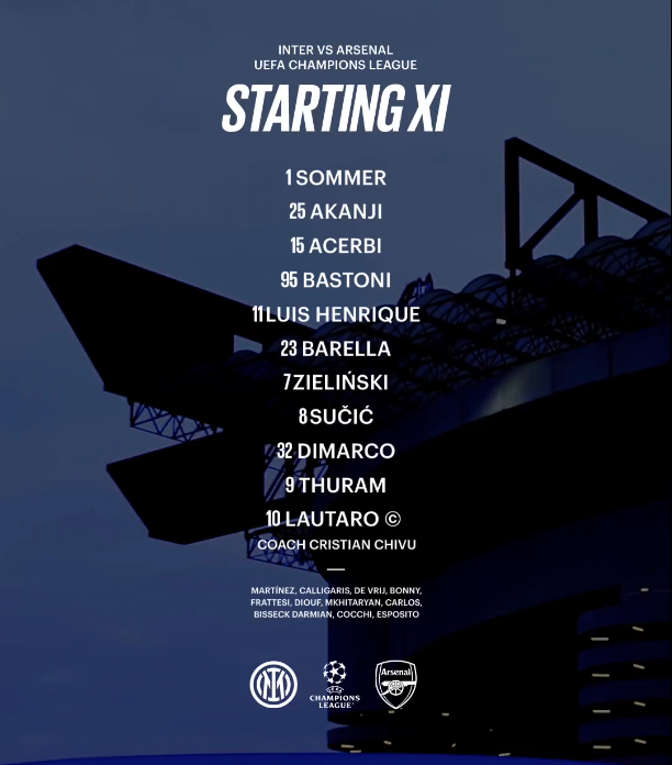 «Інтер»: Зоммер – Бастоні, Ачербі, Аканджі – Дімарко, Сучич, Зелінський (Діуф, 82), Барелла (Фраттезі, 63), Луїс Енріке (Бонні, 82) – Тюрам, Лаутаро Мартінес (Еспозіто, 63).