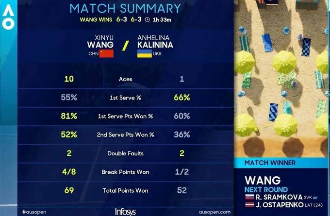 Ван Сіньюй (Китай) – Ангеліна Калініна (Україна) [Q] – 6:3, 6:3
