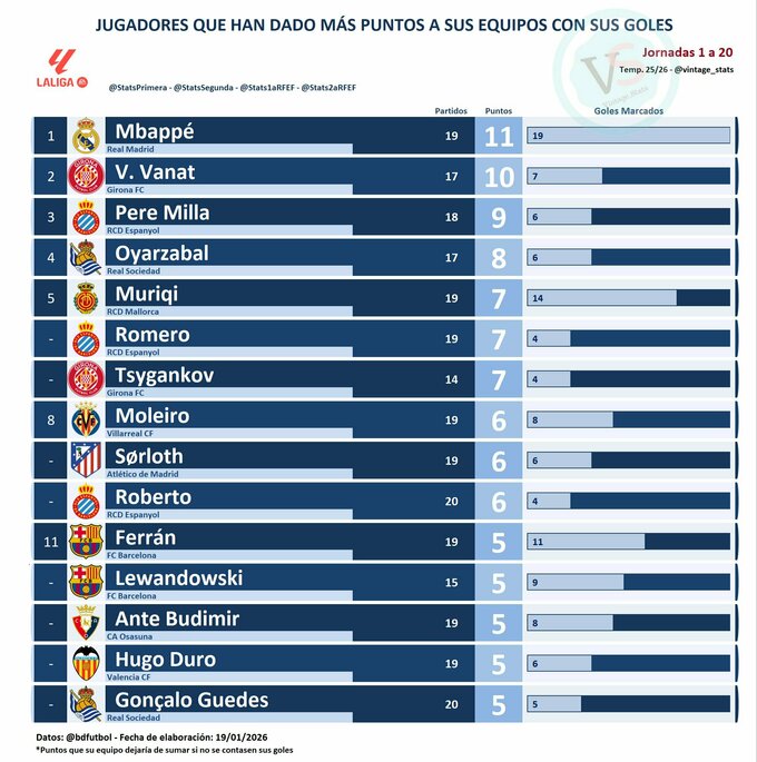 До списку увійшли ті гравці, голи яких принесли залікові бали в турнірній таблиці (перемогу або нічию). Перше місце посів форвард мадридського «Реалу» Кіліан Мбаппе, який забив 19 голів і приніс «вершковим» 11 балів.