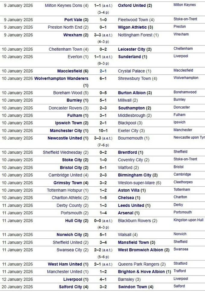 Увечері 20 січня у матчі 1/32 фіналу зіграли дві команди 4-го дивізіону: Солфорд Сіті завдав поразки Суїндон Таун із рахунком 3:2.