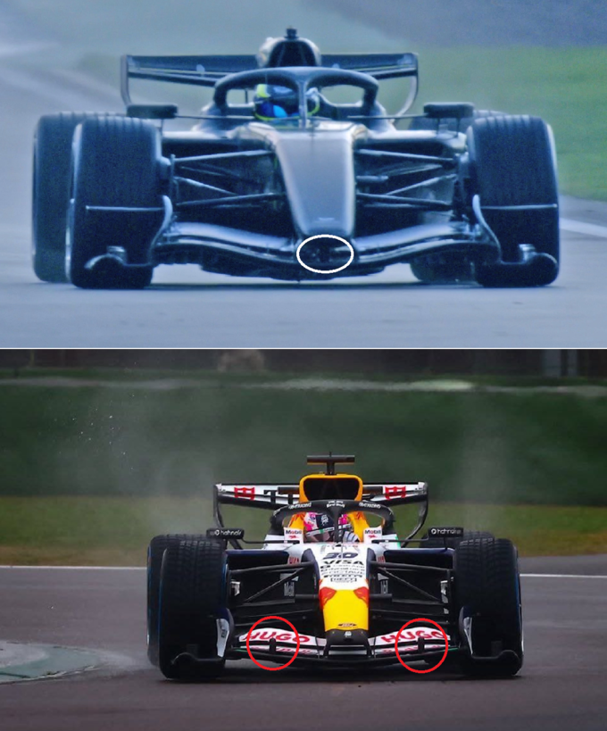 Каділлак використав один центральний механізм активної аеродинаміки, розмістивши його під носом боліда (білий еліпс на фото знизу). Рейсінг Буллз, своєю чергою, пішли іншим шляхом – із двома кріпленнями, по одному з кожного боку (червоні кола на фото знизу).