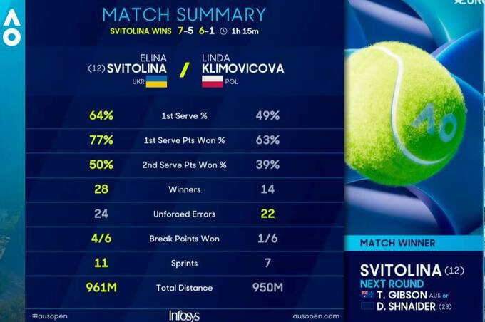 Світоліна 33-й раз у кар'єрі зіграє у третьому раунді турніру Grand Slam та 11-й раз Australian Open. Торік Еліна дісталася чвертьфіналу австралійського слему.