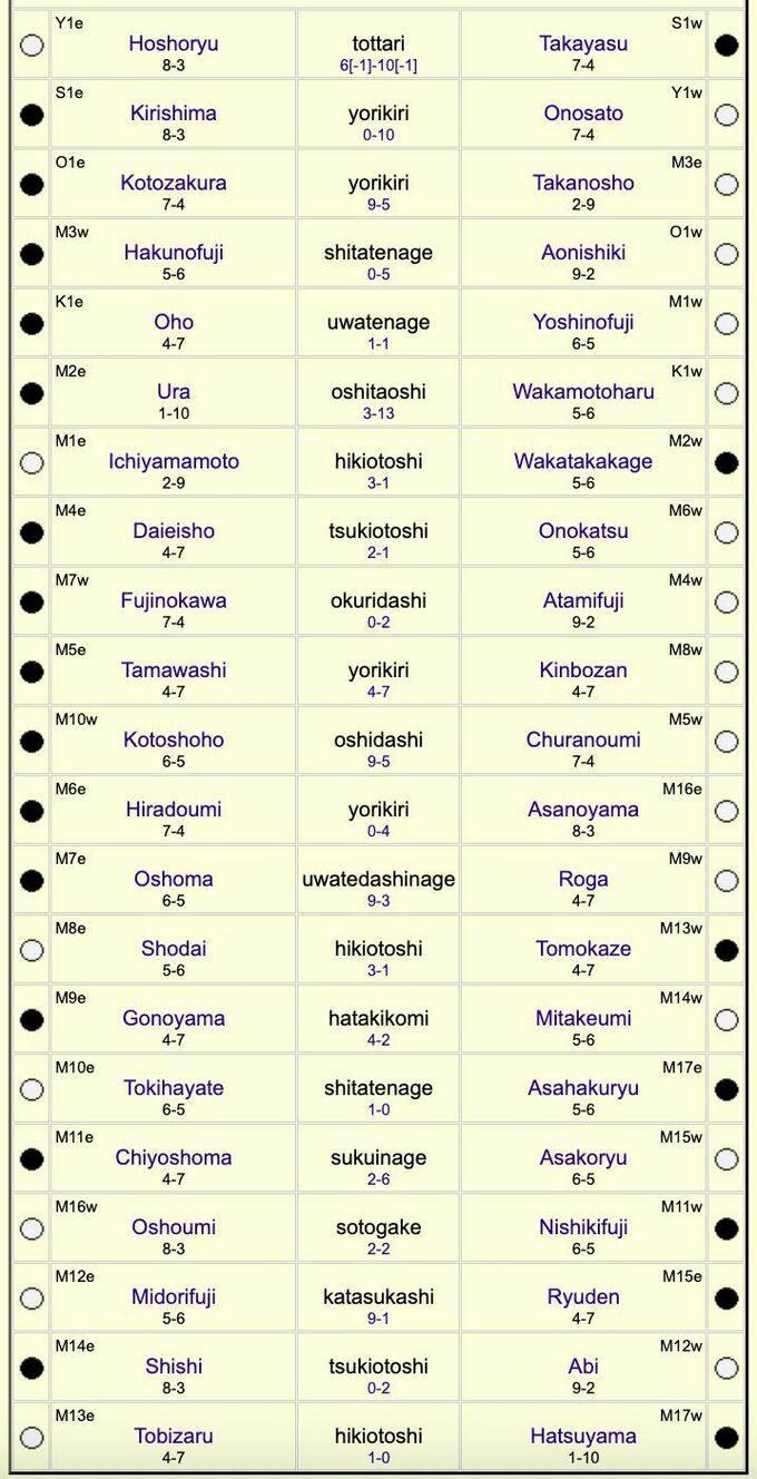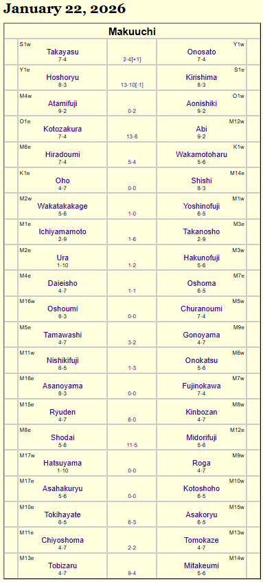 Інший йокодзуна Дайкі Оносато учора вдруге в кар’єрі програв третю сутичку поспіль. Попереднього разу щось схоже сталося два роки тому, теж на Hatsu Basho. Але тоді Оносато ще був далеким від йокодзуни – маеґашірою №15. Той турнір він закінчив з 11-ма перемогами. Зараз ситуація інша. Дайкі виступає з травмою, йому важко, а преса й спеціалісти безжально тиснуть на нього, вимагаючи достойної рангу йокодзуни боротьби.