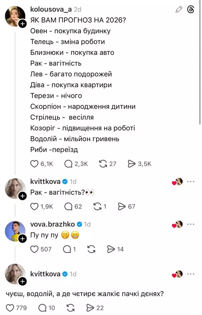 Пара Володимира Бражка та Дарії Квіткової знову опинилася в центрі уваги соцмереж. Цього разу вірусною стала історія в Threads, де все закрутилося навколо астрології.