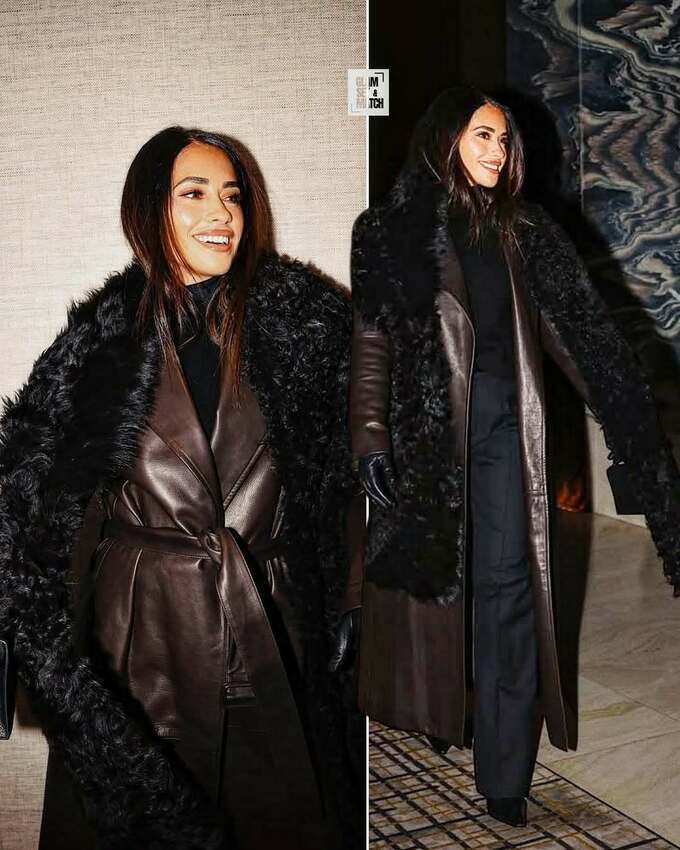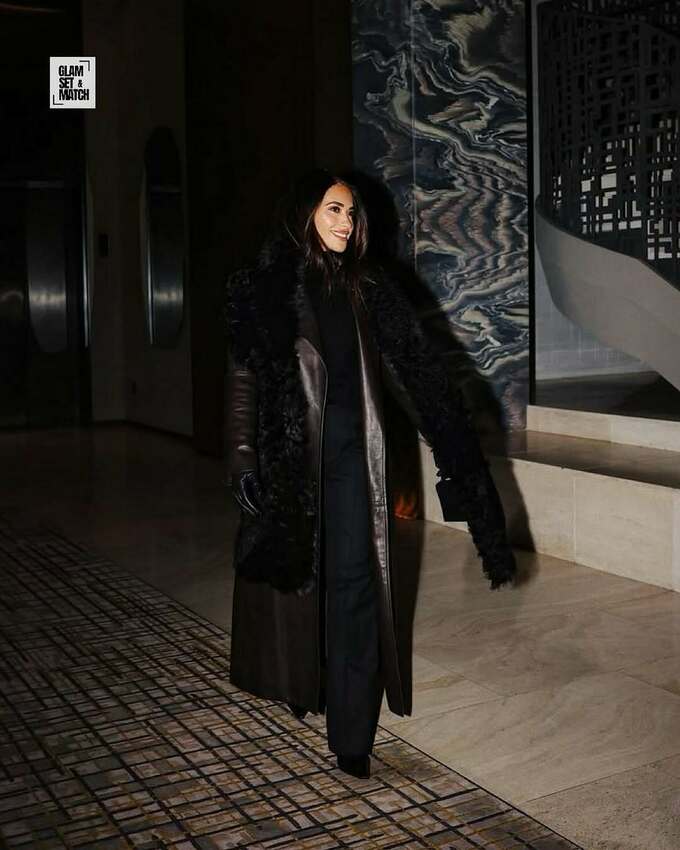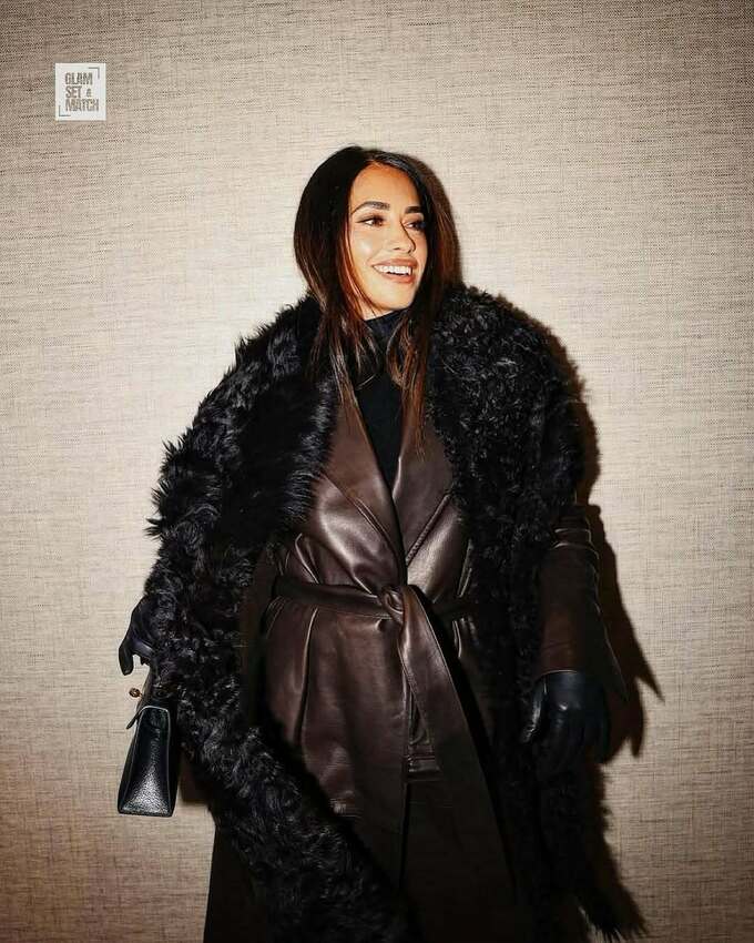 Володарка титулу «Honours 2025 WAG Fitness Icon of the Year» обрала приталене шкіряне пальто шоколадного відтінку з оздобленням із чорної овчини поверх total black-образу.
