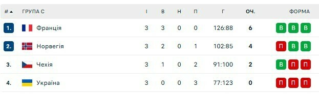 Підсумки групи C: Франція (6 очок), Норвегія (4), Чехія (2), Україна (0).
