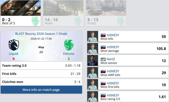 Falcons же можуть бути більш ніж задоволені стартом сезону. m0NESY став найкращим гравцем команди на обох картах і особливо на Dust2, де фактично самотужки вирішив долю першої половини та всієї серії.