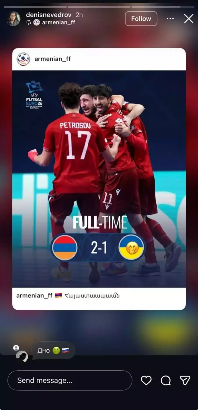 Образами на паркеті Неведров не обмежився: після гри у своєму Instagram футзаліст виставив історію з результатом матчу, а на прапор України наклав сміючийся емодзі.