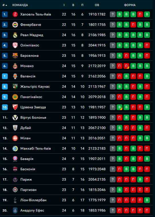Стартував 24-й тур регулярного чемпіонату Євроліги