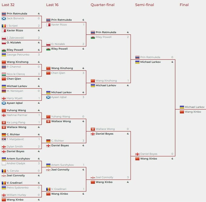 - 15:00. Михайло Ларков (Україна) – Ван Сіньбо (Китай)