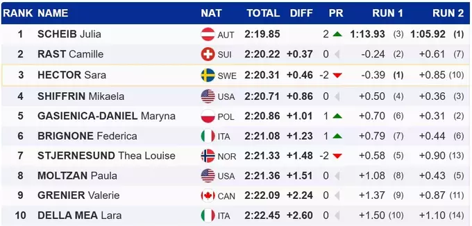 За нею розташувалася Камілла Раст зі Швейцарії, програвши 0.37 секунди. Шведка Сара Хектор неудачно показала себе в другій спробі: як підсумок, вона втратила перше місце та впала на третю сходинку.
